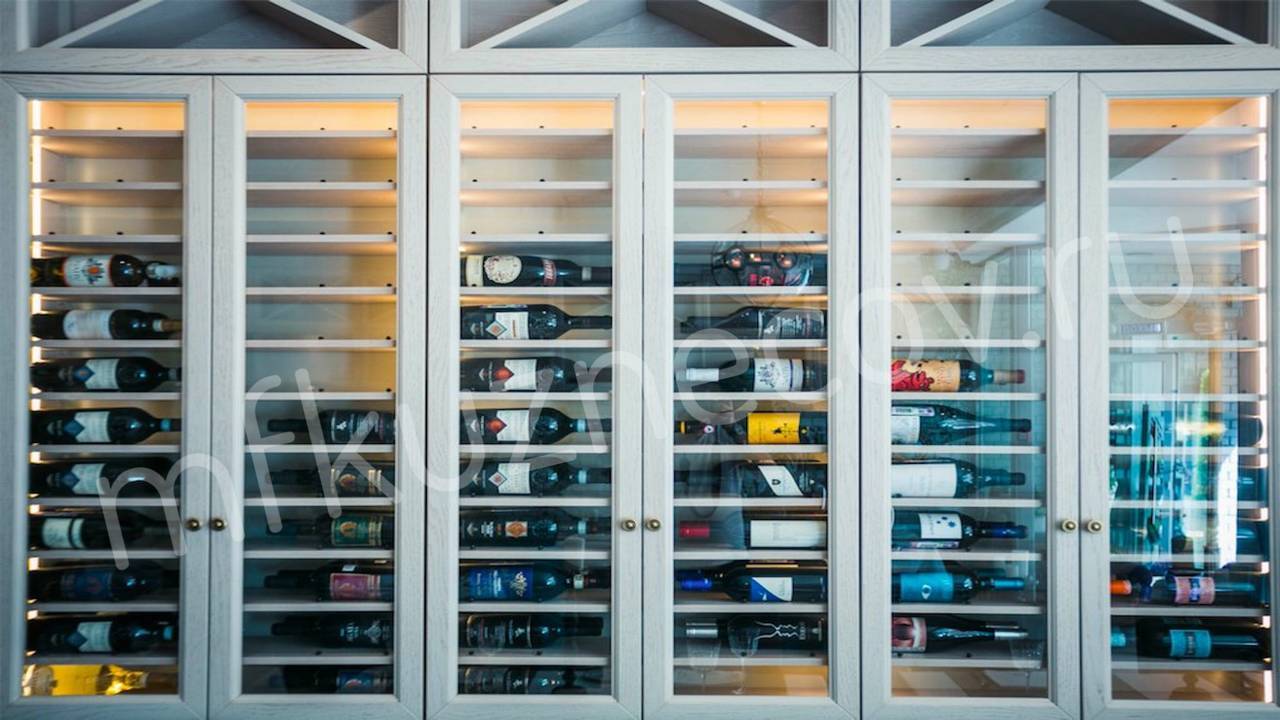 Винные шкафы, двери, остров с эффектом старины, диваны яркого и модного цвета придают помещению невероятный шик.